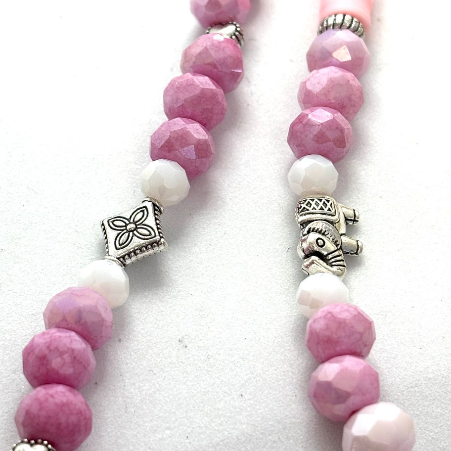Pièce unique en perles synthétiques poudre de Crystal rose à facettes 8mm et rondelles Heishi en polymère roses ainsi que différentes perles fantaisies en métal argenté dont un petit éléphant, des minis coeurs et un mini pompon rose pour agrémenter ce joli accessoire perlé.