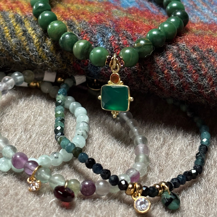 Bracelet en Jade vert du Malawi, perles rondes 6mm, associé à un pendentif rectangulaire en Onyx vert et Onyx rouge 8x10mm doré , 2 perles rondelles strass en Grenat plaqué or et une perle striée plaquée or.