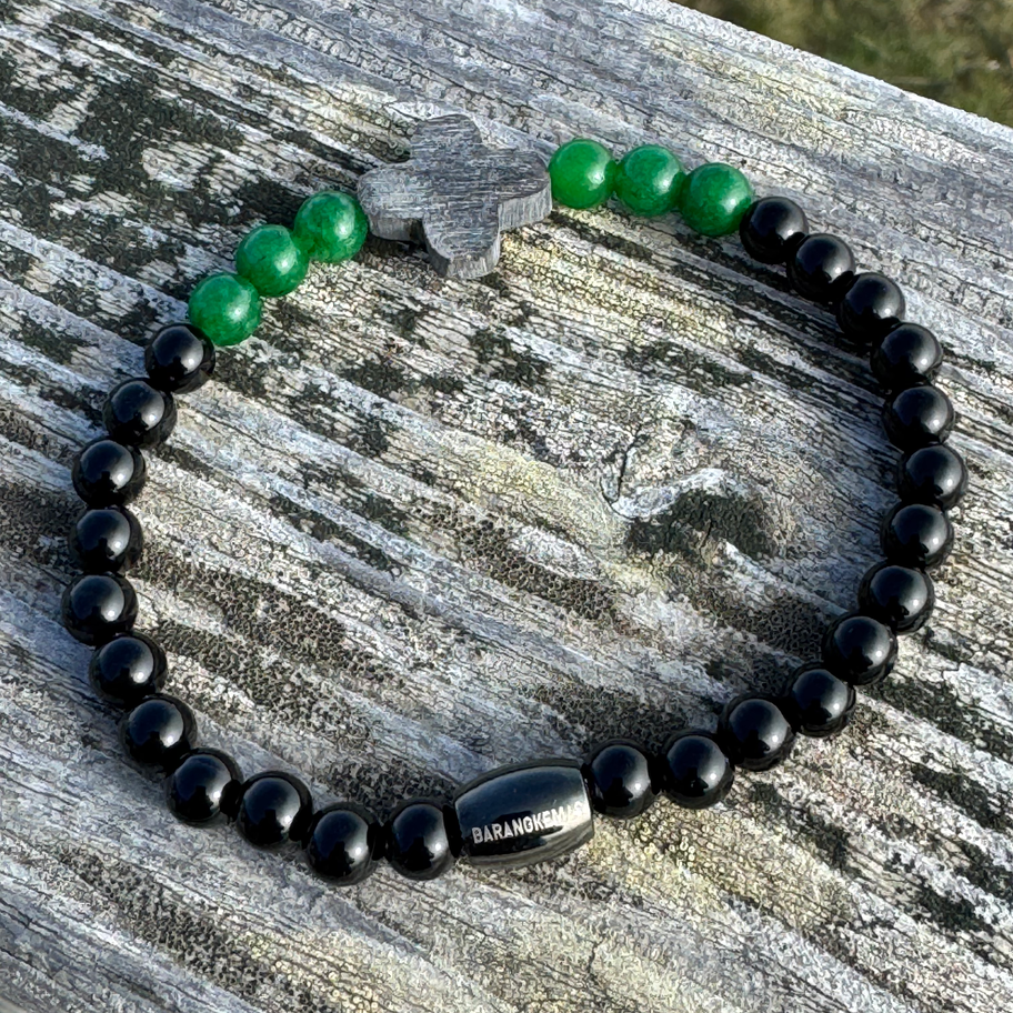Bracelet en Onyx du Brésil (Degré A) et en Jade vert de Malaisie, perles rondes 6mm, monté avec une croix en corne grise et une perle ovale Jet signature Barangkemas.