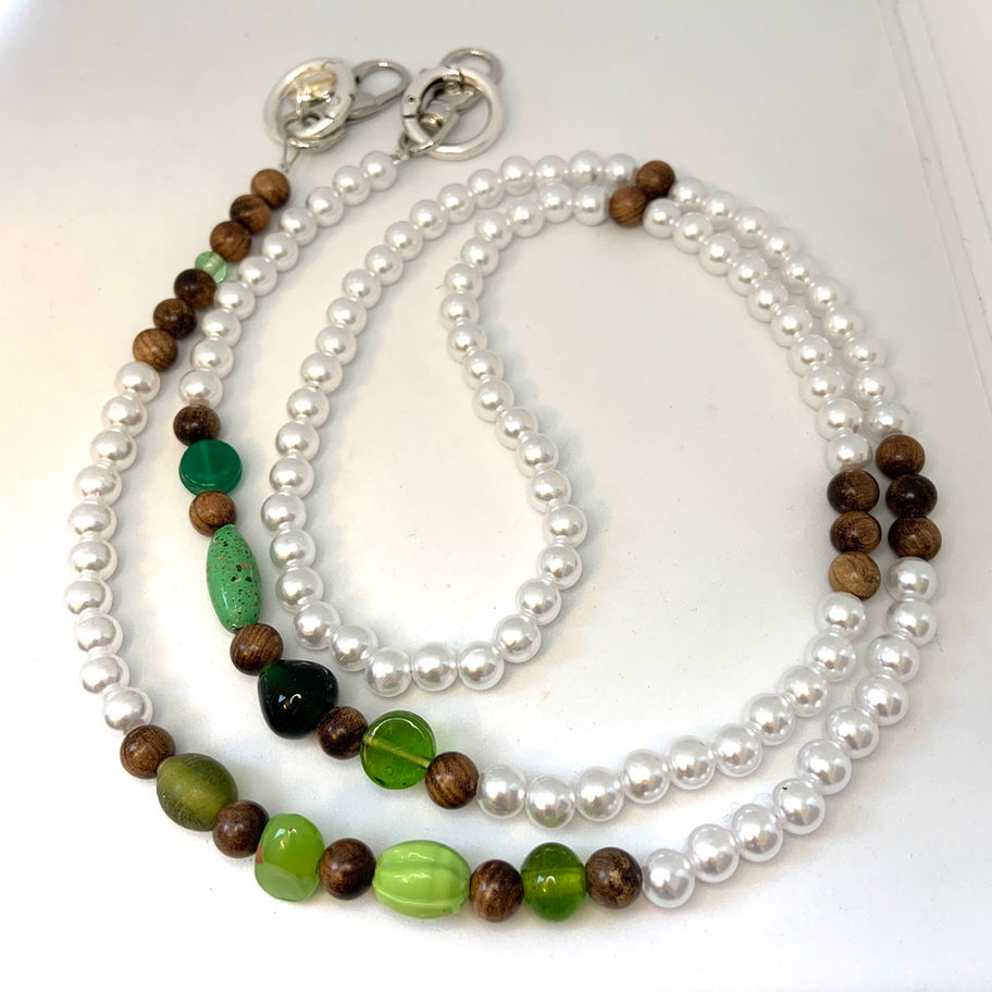 Perles: verre vert, synthétique blanc, bois de Santal naturel 8mm