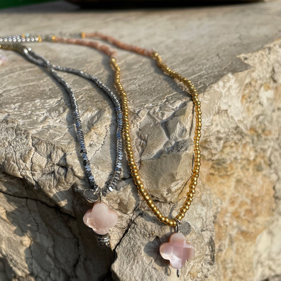 Sautoir en Pierre de soleil d’Afrique, perles rondes 4mm, Labradorite perles plates à facettes, Hématite perles rondes 4mm, perles de rocailles dorées métalliques, 2 perles en or 4mm, 4 rondelles fleurs dorées à l’or fin montée avec un pendentif trèfle en nacre rose.