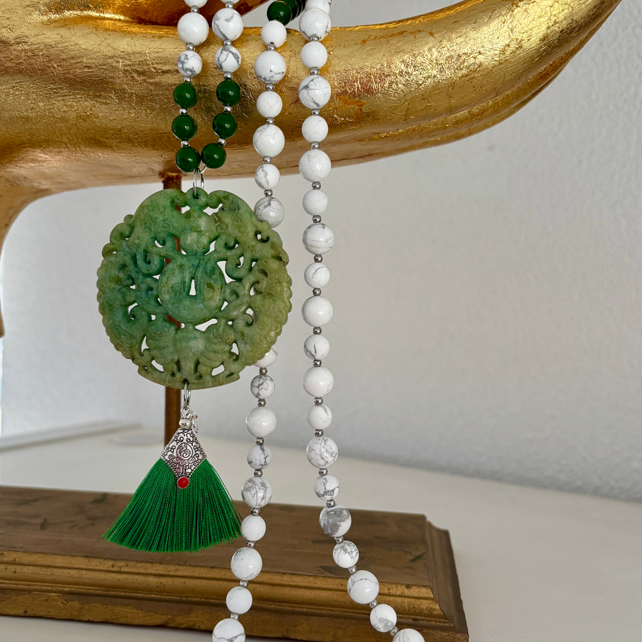 Sautoir en Howlite et Jade & pendentif en jade vert